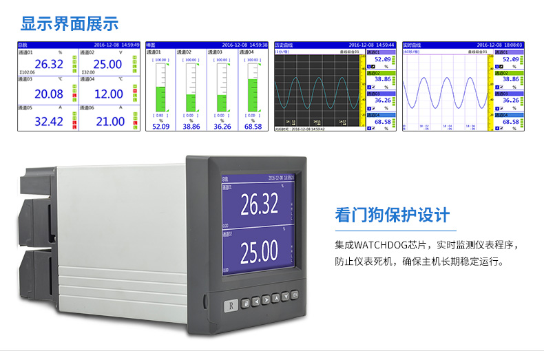 產品簡介:SIN-R6000D系列無紙記錄儀是一種高速高性能微處理器和5.6英寸彩色液晶顯示屏,對現場各種溫度、壓力、流量、電量等信號實現監測、控制和記錄功能。 SIN-R6000D系列無紙記錄儀可自由組態輸入標準電流、標準電壓、熱電偶、熱電阻、頻率等信號,可實現為傳感器配電和繼電器報警輸出,并且可通過U盤或通訊方式與上位機進行數據交換。
