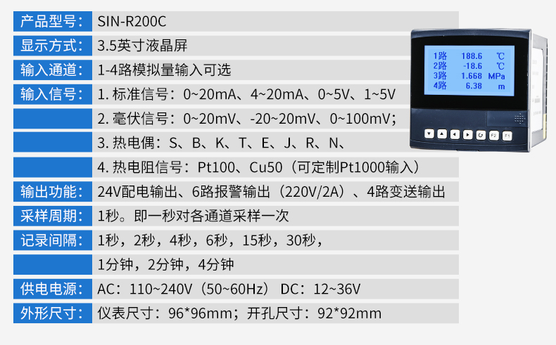 • 產品簡介:SIN-R200C顯示采用 3.5 英寸 高分辯率點陣式白屏黑字液晶屏,軟件上引入中文WINDOWS 的框架思路,并采用了數據壓縮技術。帶 USB 數據轉存功能,存儲時間最長可達 720 天。儀表全面采用了表面貼裝工藝,并采用多保護和隔離設計,抗干擾能力強,可靠性高。儀表可同時輸入 4 路萬能信號,輸入通道相互隔離,并具有報警控制、模擬變送、RS485/232 通訊等輸出功能,是一款功能齊全的漢顯儀。
