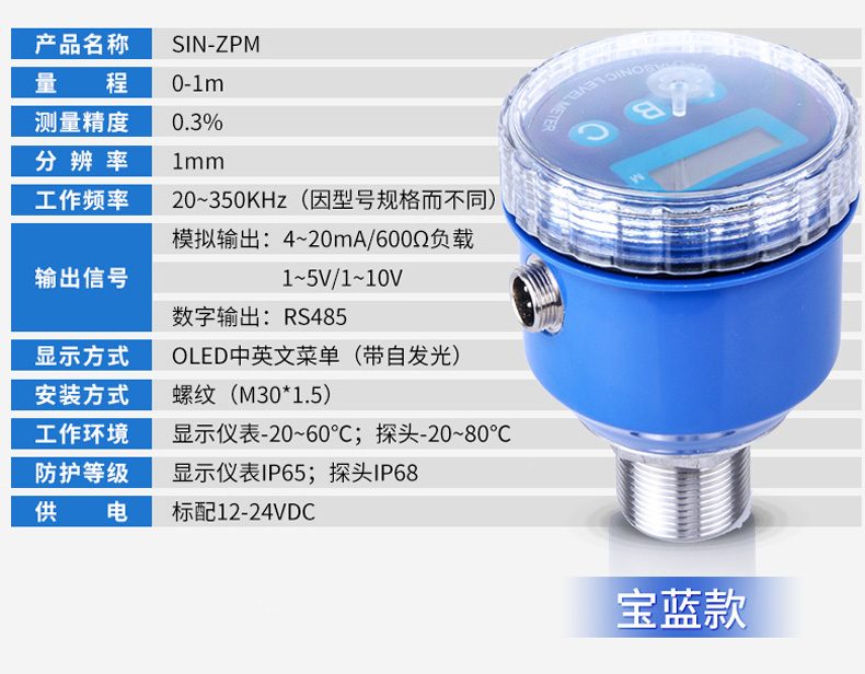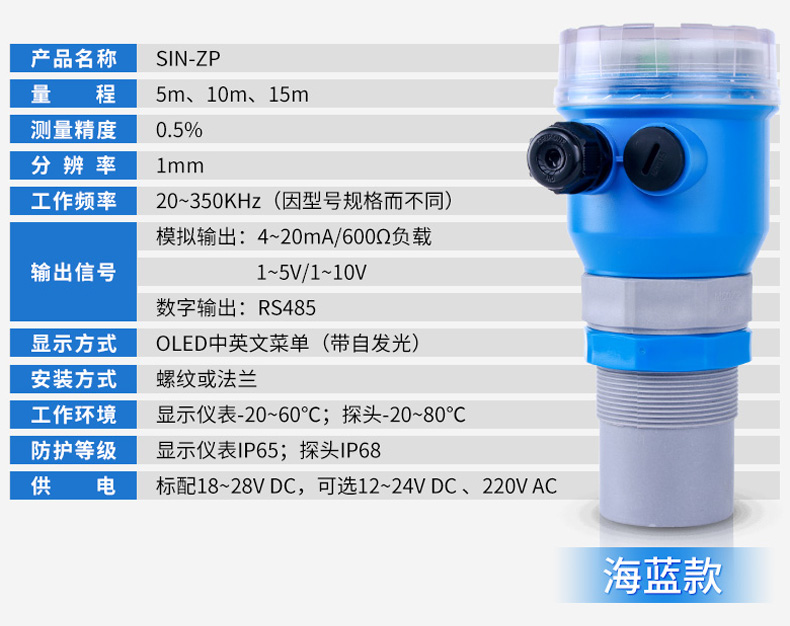 產品簡介:SIN-MP超聲波液位/物位計采用超聲波脈沖原理進行非接觸式的測量,是一種非接觸式、可靠性、性價比、易安裝維護的物位測量儀器。它不必接觸介質就能滿足大部分物位測量要求,集液位水位測距顯示變送等功能于一體,被測介質幾乎不受限制,可廣泛應用于各種液體和固體物料高度的測量。