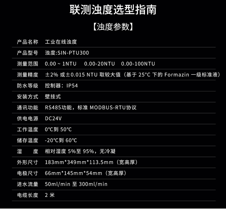 產(chǎn)品簡介:聯(lián)測_SIN-PTU300三個(gè)量程段規(guī)格,分別為0-1NTU量程段,0-20NTU量程段,0-100NTU量程段,其中0-1NTU量程段主要應(yīng)用出水濁度低、測量要求高的場合,其最低檢出限為0.015NTU,可穩(wěn)定監(jiān)測<0.1NTU水質(zhì),可配套小型凈水設(shè)備。
